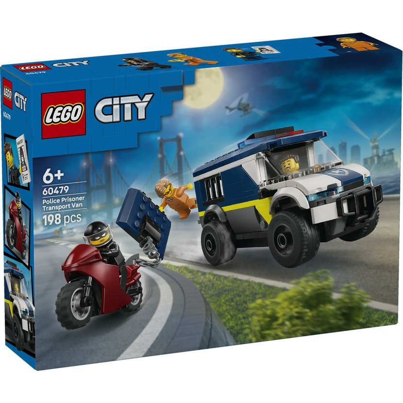 Připravte se na napínavá dobrodružství se stavebnicí LEGO® City Policejní dodávka pro převoz vězňů (60479) pro děti od 6 let. Model policejního vozu má propracovanou kabinu řidiče a vězeňskou celu s prostorem pro 2 zločince. Děti můžou pomocí hračky v podobě motocyklu s řetězem a hákem vytrhnout dveře cely. Stačí přidat minifigurku policisty a 2 minifigurky zločinců a můžete si přehrát na napínavou scénu s útěkem z vězení. Tato stavebnice policejního vozidla je ideální pro kreativní děti a fanoušky policejních stavebnic LEGO City a poslouží jako skvělý dárek k narozeninám nebo k jakékoli jiné příležitosti. Přidejte tuto stavebnici k dalším vozidlům záchranných služeb LEGO City (prodávají se samostatně) a užijte si ještě více akce a fantastických příběhů. Aplikace LEGO Builder dodává dětem jistotu a oporu při stavění. Své modely v ní mohou přibližovat a otáčet ve 3D, a sledovat postup pomocí srozumitelného digitálního návodu. Stavebnice obsahuje 198 dílků.
