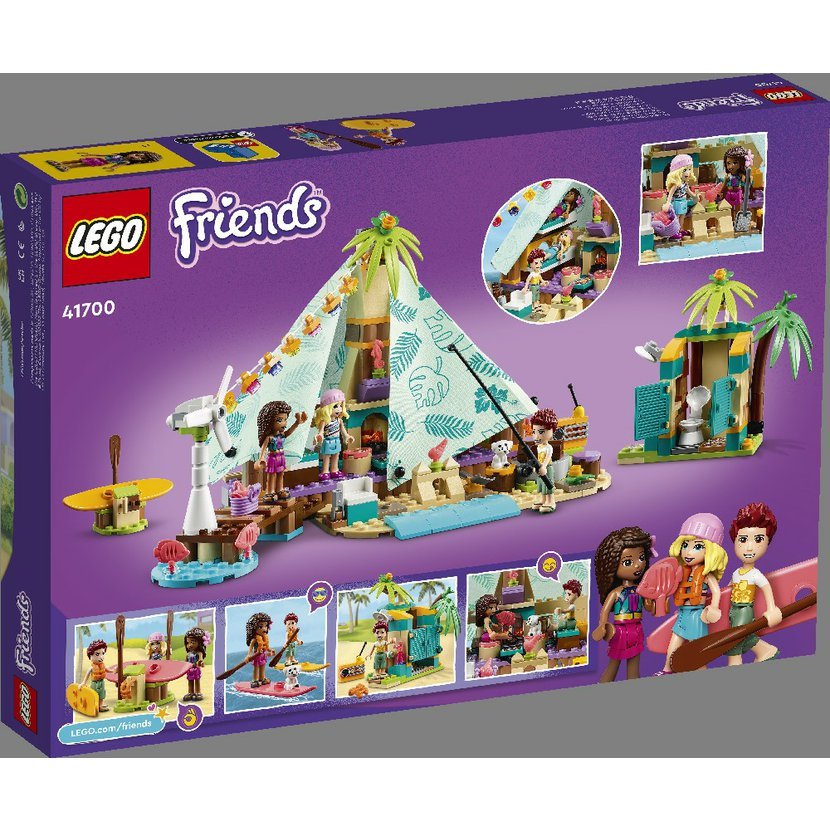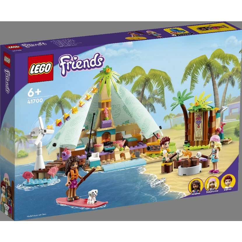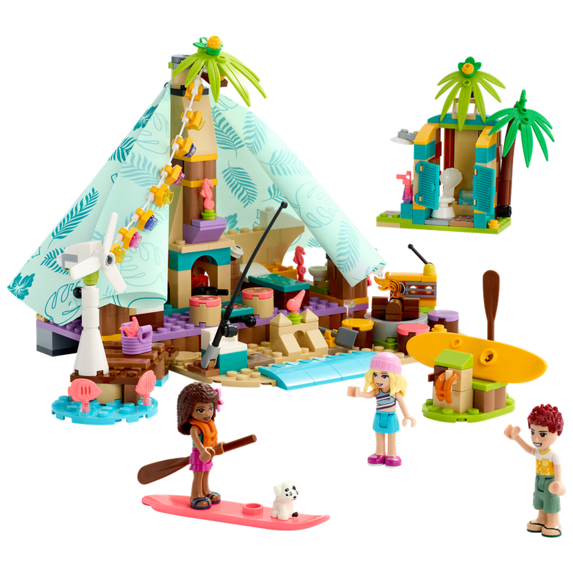 • Stylové kempování – Stavebnice Luxusní kempování na pláži (41700) od LEGO® Friends obsahuje 3 minipanenky, figurku štěňátka, stan s palandami, vařičem a látkovou střechou, a k tomu navíc funkční větrnou turbínu, která napájí osvětlení