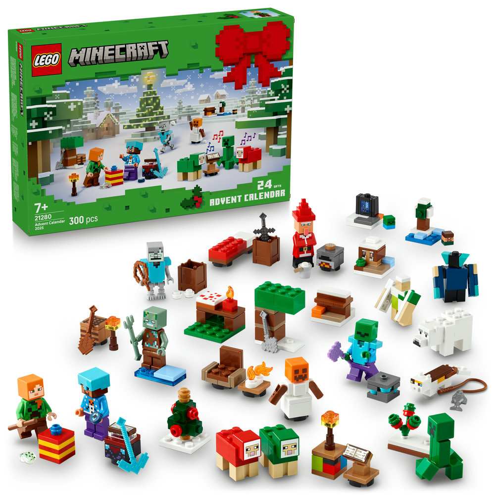 LEGO® Minecraft® (21280) Adventní kalendář 2025 obsahuje 24 sestavitelných vánočních dárečků, minifigurky LEGO a sběratelské předměty z videohry pro děti a fanoušky Minecraftu od 7 let. Za každým z 24 okének se skrývá jeden dáreček pro děti. Mezi minifigurkami najdete Alex ve svetru s motivem Creepera, Stevea ve svetru s motivem sněhuláka, diamantové helmě a s krumpáčem v ruce, Creepera u keře s bobulemi, utopence s trojzubcem, bludného kostlivce s diamantovou zbrojí, sněžného golema, zombie s očarovanou sekerou a vesničana Santu s pecí. Součástí je také spousta miniaturních modelů a parádních doplňků, které děti dobře znají ze své oblíbené hry. S blížícími se Vánocemi děti můžou jednotlivé dárečky kombinovat a vytvořit si mikro model zimní vesničky Minecraft plný nápaditých dobrodružství. Součástí stavebnice je navíc rozkládací hrací podložka, která poslouží jako dokonalé pozadí.