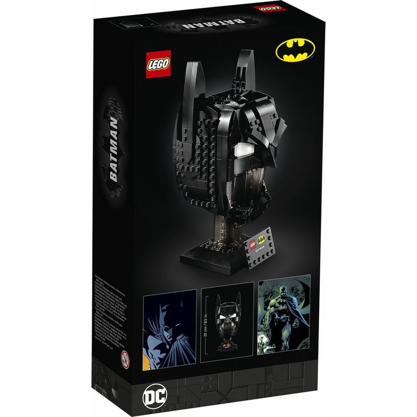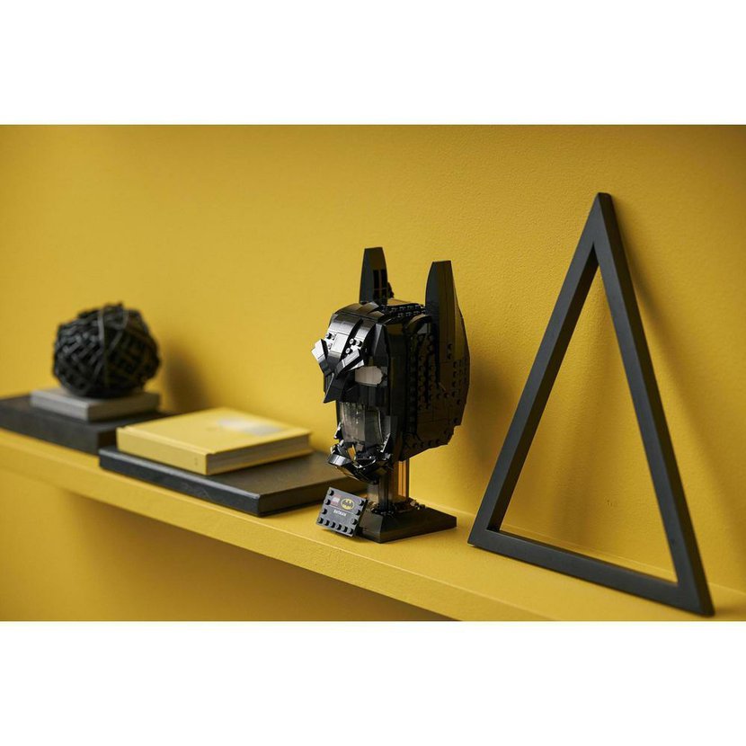 • Autentický LEGO® model kultovní Batmanovy helmy obsahuje průsvitné dílky znázorňující tvář a stylový informační štítek připevněný k robustnímu podstavci.