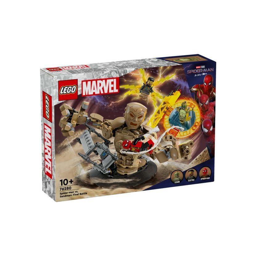 Hledáte moderní dárek pro malé superhrdiny, kteří milují filmy od Marvelu? Akční stavebnice LEGO® Marvel (76280) Spider-Man vs. Sandman: Poslední bitva je přesně to pravé! Představuje perfektní dárek pro děti od 10 let, které s ní znovu prožijí bitevní scénu z filmu Spider-Man: Bez domova od studia Marvel. Součástí této kreativní stavebnice z řady LEGO Marvel se Spider-Manem jsou 3 padouchové: Sandman, Electro a Lizard (jedná se o zcela první stavebnici LEGO Marvel s minifigurkou Lizarda). Minifigurky lze umístit hned na několik míst v různých polohách a stavebnice tak nabízí nepřeberné možnosti hraní a vystavování. Sandman je plně pohyblivý a děti ho mohou otáčet a chytat do jeho obřích rukou Spider-Mana, který se nad ním vznáší na svémpavučinovém „laně“. Stavebnici lze kombinovat se sadou Spider-Manova konečná bitva (76261) (prodává se samostatně) pro další herních možnosti. Pro ještě více digitální zábavy je zde zábavná a intuitivní aplikace LEGO Builder, kde mohou stavitelé přibli žovat a otáčet modely ve 3D a sledovat postup.