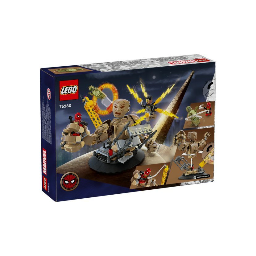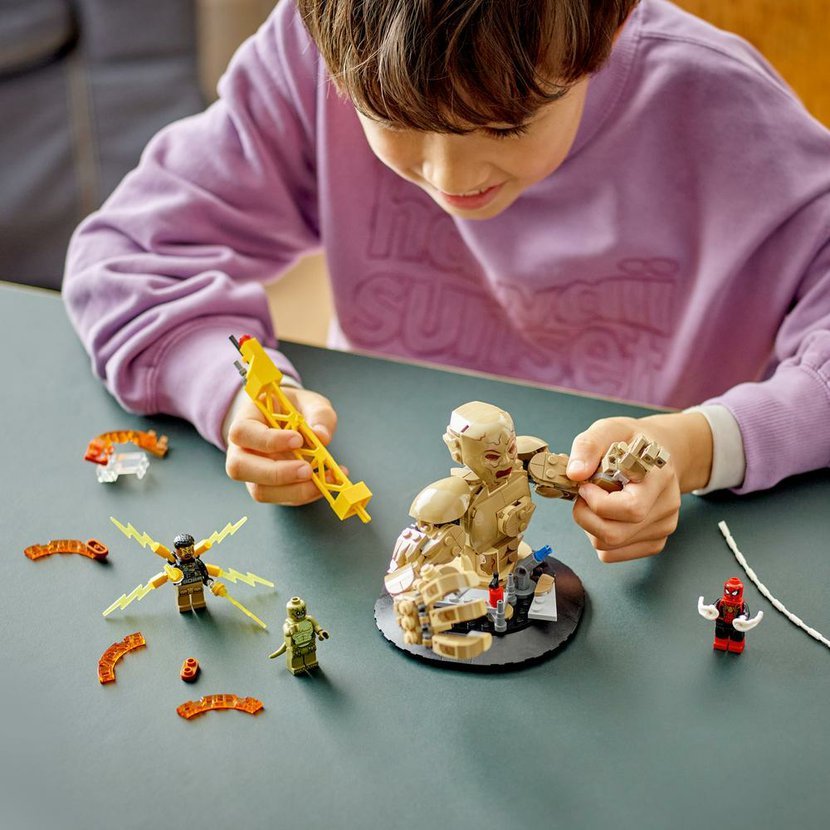 • Parádní bitevní model z kostek LEGO® – Malí fandové filmů od Marvelu mohou otáčet plně pohyblivý model Sandmana a chytat do jeho obřích rukou Spider-Mana, který se nad ním vznáší na svém pavučinovém „laně“