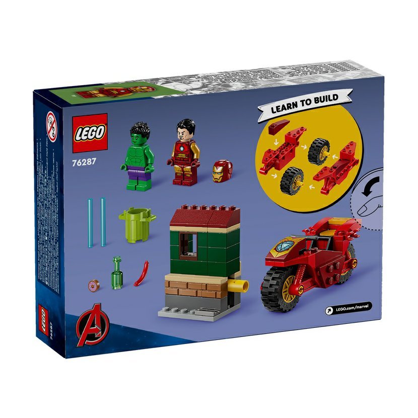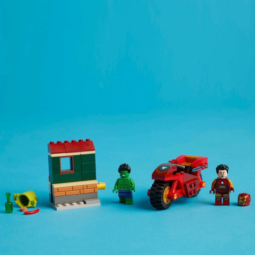 Stavebnice LEGO Marvel obsahuje minifigurky Iron Mana a neuvěřitelného Hulka, k tomu navíc Iron Manovu sestavitelnou motorku a sestavitelný dům. Děti aktivují funkci, která budovu zhroutí (což se stává často, když je Hulk poblíž!) a pak ji znovu postaví, právě včas na Hulkův další výbuch. Součástí stavebnice je začátečnická kostka s rámem vozidla, která dětem pomůže se stavěním. Intuitivní návod najdete v barevném obrázkovém průvodci. Pro ještě větší digitální zábavu mohou stavitelé přibližovat a otáčet modely pomocí intuitivní aplikace LEGO Builder.