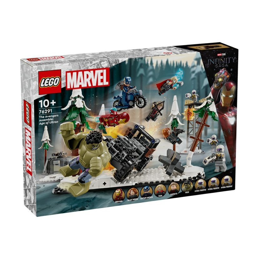 Stavebnice The Avengers Assemble: Age of Ultron (76291) je sběratelská superhrdinská stavebnice LEGO® plná autentické akce Avengers. Díky kultovním postavám od Marvelu a modulárnímu mega designu se jedná o ideální dárek pro fanoušky superhrdinských stavebnic, minifigurek LEGO Marvel a modelářství od 10 let. Stavebnice je založena na velké bitevní scéně z filmového hitu Avengers: Age of Ultron od Marvel Studios. Součástí všestranné stavebnice je 5 minifigurek Avengers – Hawkeye, Black Widow, Kapitán America, Iron Man a Thor – velká figurka Hulka a 3 minifigurky vojáků Hydry. Pět (5) modulů, které stavebnici tvoří, lze nakonfigurovat na nekonečné herní možnosti nebo kombinovat a vytvořit tak působivý výstavní kousek. Obsahuje celou řadu zbraní a doplňků, které inspirují k nápaditému hraní, a také terénní vozidlo. Intuitivní aplikace LEGO Builder dětem umožní přibližovat si modely, otáčet je ve 3D, ukládat stavebnice a sledovat postup při stavění. Stavebnice Avengers – Tato sestavitelná superhrdinská stavebnice představuje epickou bitvu z filmu Avengers: Age of Ultron od studia Marvel s řadou minifigurek a autentických prvků LEGO® Marvel