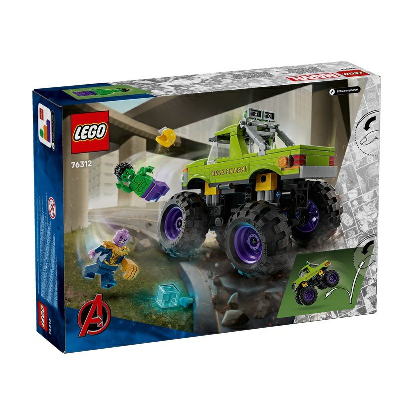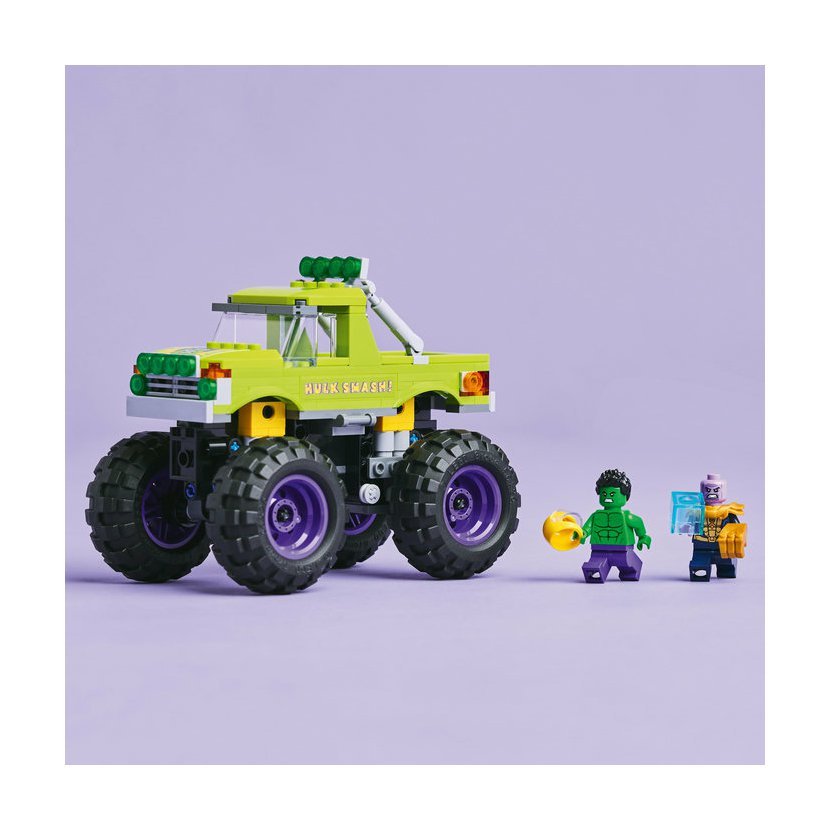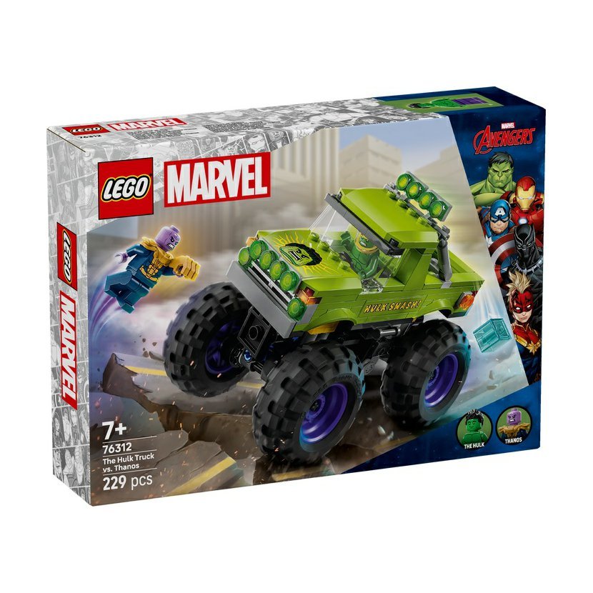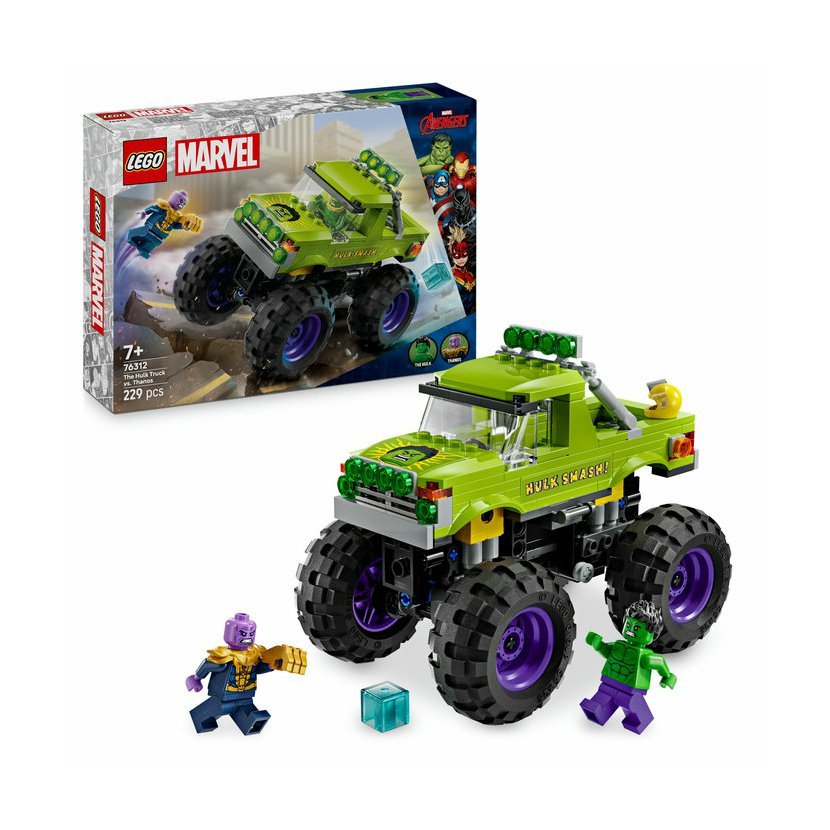 Stavebnice LEGO® | Marvel (76312) Hulkův truck vs. Thanos obsahuje Hulkův obří truck a 2 minifigurky superhrdinů. Tento vysoce kvalitní dárek pro kluky a holky od 7 let představuje skvělý dárek pro děti, které milují filmy Marvel Avengers, velké trucky a dobrodružství se stavebnicemi LEGO. Tento sestavitelný výkonný truck LEGO | Marvel obsahuje minifigurku Hulka s odnímatelnou helmou a minifigurku Thanose s teseraktem a Rukavicí nekonečna. Superhrdinský truck má zvedací kabinu s přístupem na sedadlo řidiče a místem pro minifigurku Hulka. Vnější strana trucku je zelená a zdobí ji nápis „Hulk Smash!“ a Hulkův obličej. Díky velkým otočným kolům, robustní konstrukci a odpružení zvládne tento mega truck i ty nejnáročnější mise. Pro ještě větší digitální zábavu si stavitelé můžou přibližovat a otáčet modely ve 3D a sledovat svůj pokrok pomocí zábavné a intuitivní aplikace LEGO Builder. Model obsahuje 229 dílků. Hulkův truck s velkými koly – Stavebnice LEGO® | Marvel Hulkův truck vs. Thanos pro kluky a holky od 7 let dětem přináší akční superhrdinské vozidlo