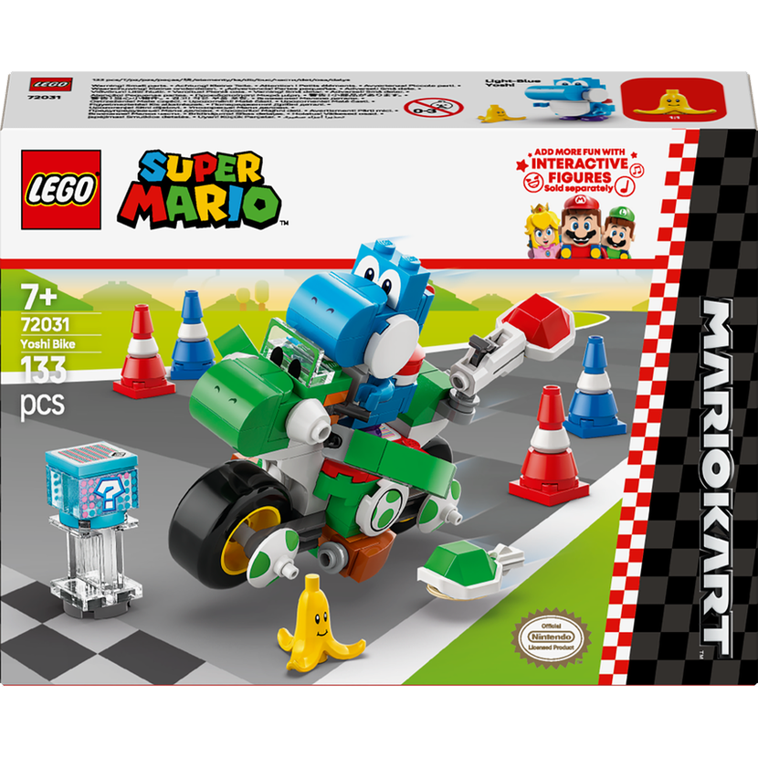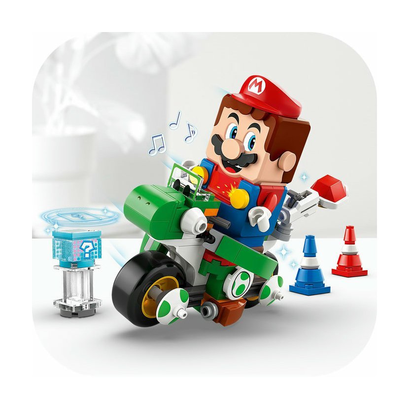 Interaktivní hraní – Usaďte na motorku Yoshi Bike figurku LEGO® Mario™, LEGO® Luigi™ nebo LEGO® Peach™ (figurky nejsou součástí balení), aktivujte zvukové a vizuální efekty Mario Kart™ a získejte digitální předměty z krabice Item Box