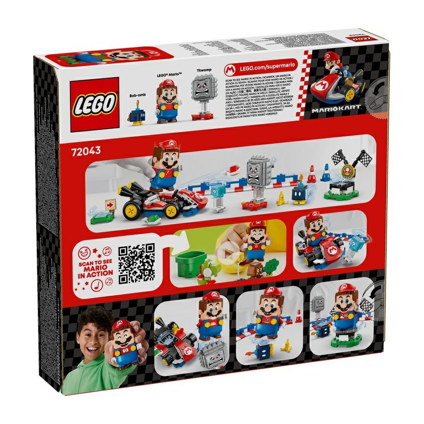 Děti si s touto stavebnicí Mario Kart™ (72043) z kostek vytvoří vlastní závodní dráhu a společně s LEGO® Mariem v motokáře Standard Kart se vydají na interaktivní závody. Fantastická stavebnice LEGO® Super Mario™ pro kluky, holky a gamery od 7 let obsahuje interaktivní figurku LEGO Maria a Standard Kart s funkcí driftování a střílení krunýřů pro zábavné závodění a hraní. Součástí závodní dráhy je také startovní dráha, připojitelné bariéry, dopravní kužely a kruh vítězů. Řiďte Standard Kart s LEGO Mariem a aktivujte zvuky a vizuální efekty Mario Kart, získejte digitální odměny z krabice Item Box, porazte Bob-omba a Thwompa a sledujte, jak LEGO Mario reaguje na zelené a červené destičky LEGO. Objevte celou řadu stavebnic LEGO Super Mario: Mario Kart (prodávají se samostatně) a získejte další vozidla a postavy pro ještě větší porci zábavy. Návod na stavění najdete v krabici nebo v aplikaci LEGO Super Mario. Tato stavebnice obsahuje 278 dílků. Set Mario Kart™ pro děti z kostek – Vytvořte zábavnou trať LEGO® Super Mario™ pro interaktivní závody s LEGO® Mariem v motokáře Standard Kart s tímto setem Nintendo® LEGO